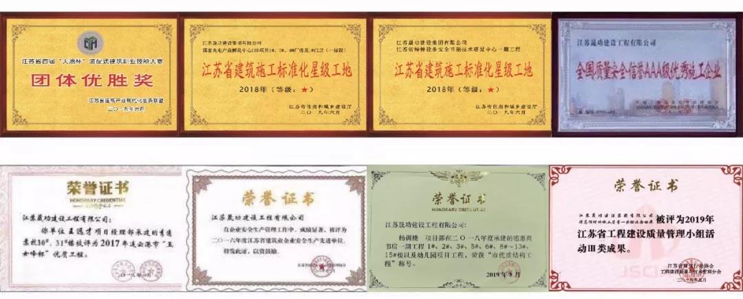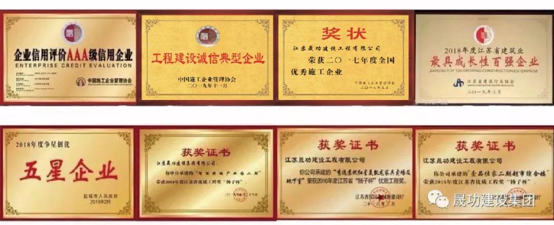 晟功建设集团立足江苏,面向全国,已将业务延伸至安徽、浙江、辽宁、河南、甘肃、山东、新疆、黑龙江等省市,承建了一大批精品工程,相继荣获“扬子杯”、“玉女峰杯”、“盐阜杯”等百余项荣誉。晟功建设集团凭借良好的诚信口碑和高效卓越的运营质量,从无社会矛盾、经济纠纷、法律官司,连续多年在全省免交农民工工资保证金,被评为“全国企业社会信用评价AAA级信用企业”、“全国优秀施工企业”、“工程建设诚信典型企业”、“江苏省最具成长性百强企业”、“盐城市建筑业发展工作先进企业”,连续3年获得盐城市“星级企业”。2019年在南京举办的江苏省“大地杯”装配式建筑职业技能竞赛中,晟功建设集团获得了“团体优胜奖”的好成绩。