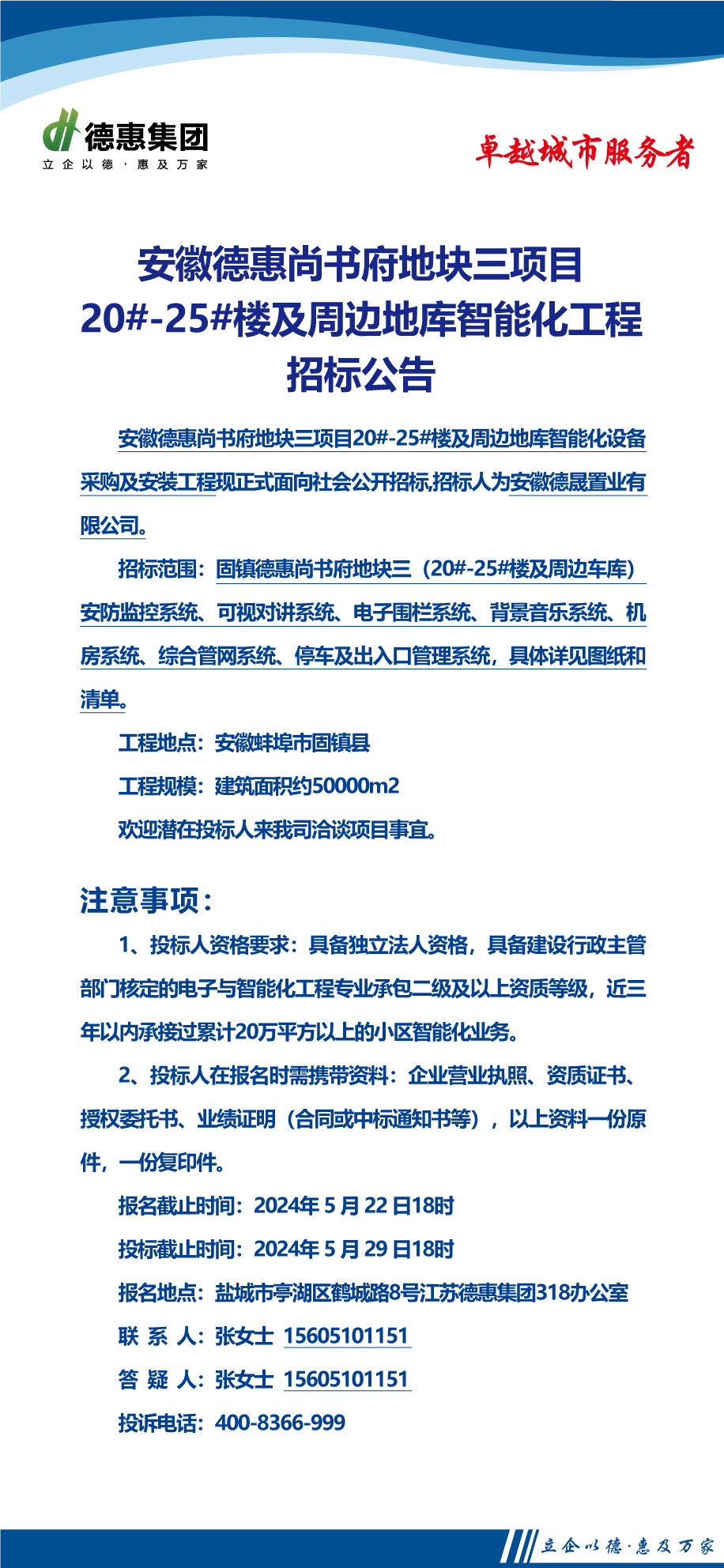 安徽固镇德惠尚书府地块三(20#-25#楼及周边车库)智能化设备采购及安装工程