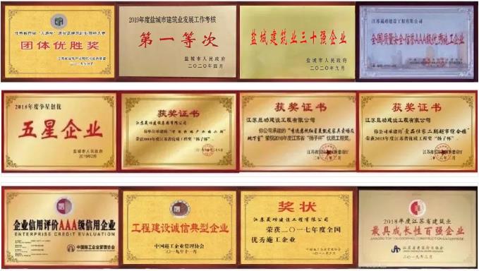 晟功建设集团立足江苏,面向全国,承建六百余项工程,相继荣获“扬子杯”、“玉女峰杯”、“盐阜杯”等百余项荣誉。自成立以来,集团连续多年在全省免交农民工工资保证金,被评为“全国企业社会信用评价AAA级信用企业”、“全国优秀施工企业”、“工程建设诚信典型企业”、“江苏省最具成长性百强企业”、“盐城市建筑业发展工作先进企业”,连续四年获得了盐城市“争星创优”星级企业,名列2019年度盐城市建筑业发展考核“第一等次”、“盐城市建筑业30强”,2020年获得江苏省建筑产业现代化创新联盟年度突出贡献单位。