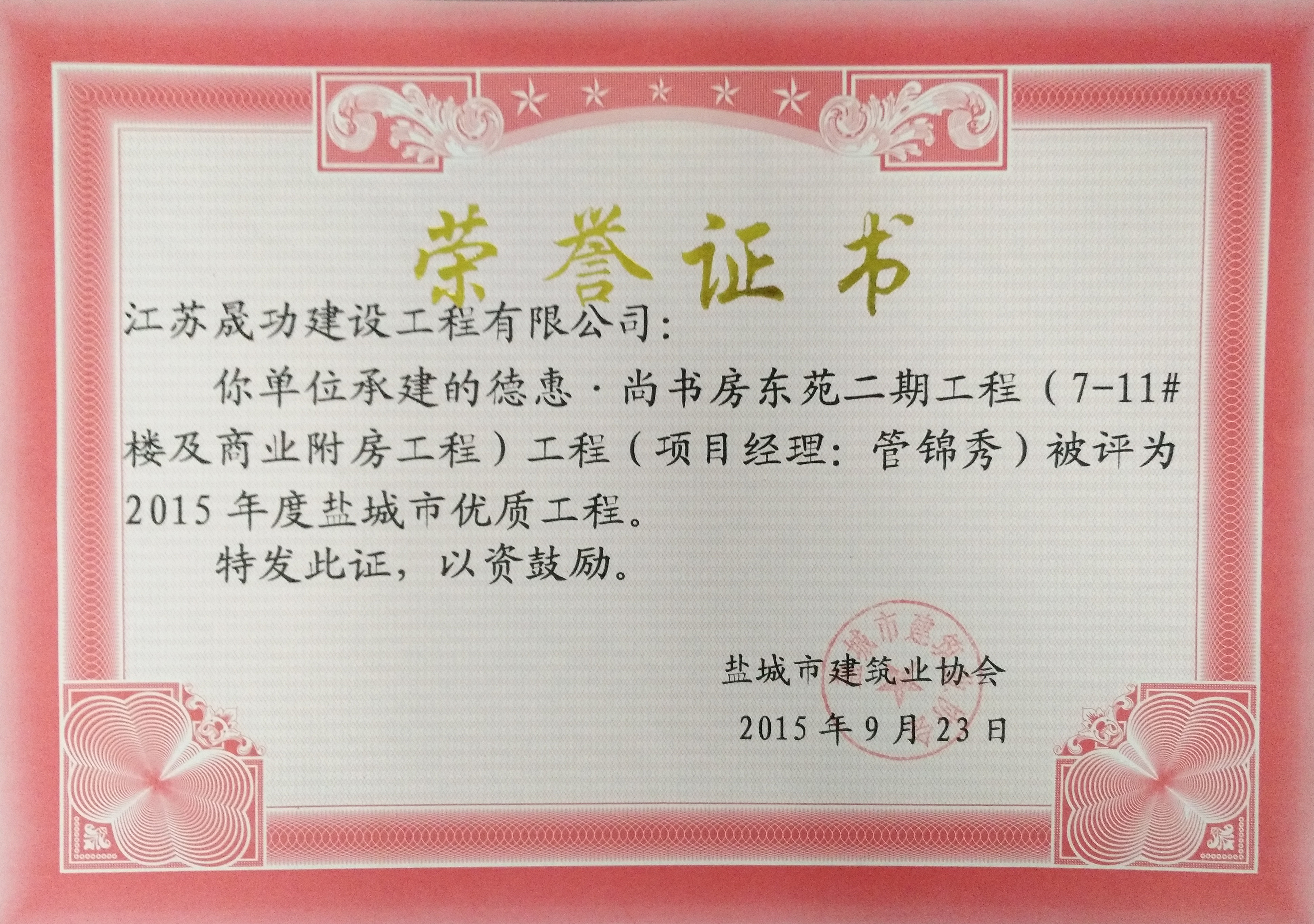 2015年10月16日,德惠·尚书房东苑二期工程(7-11#楼及商业附房工程)被评为2015年度盐城市优质工程!