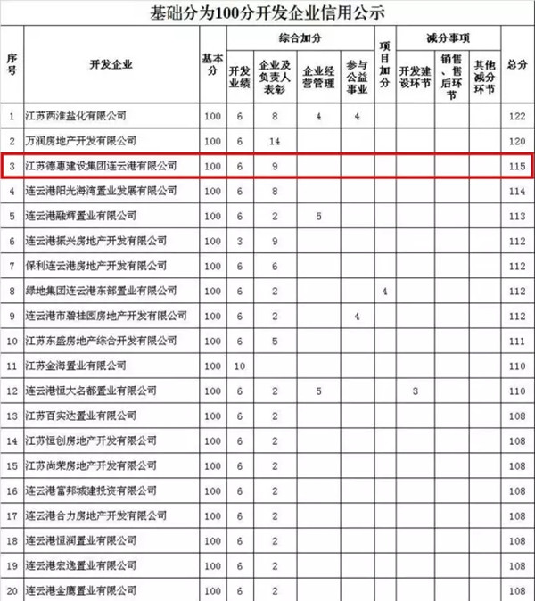 2016年2月17日,连云港市区开发经营的269家房地产开发企业信用情况进行了考评结果公示,江苏德惠建设集团排名前三。 |