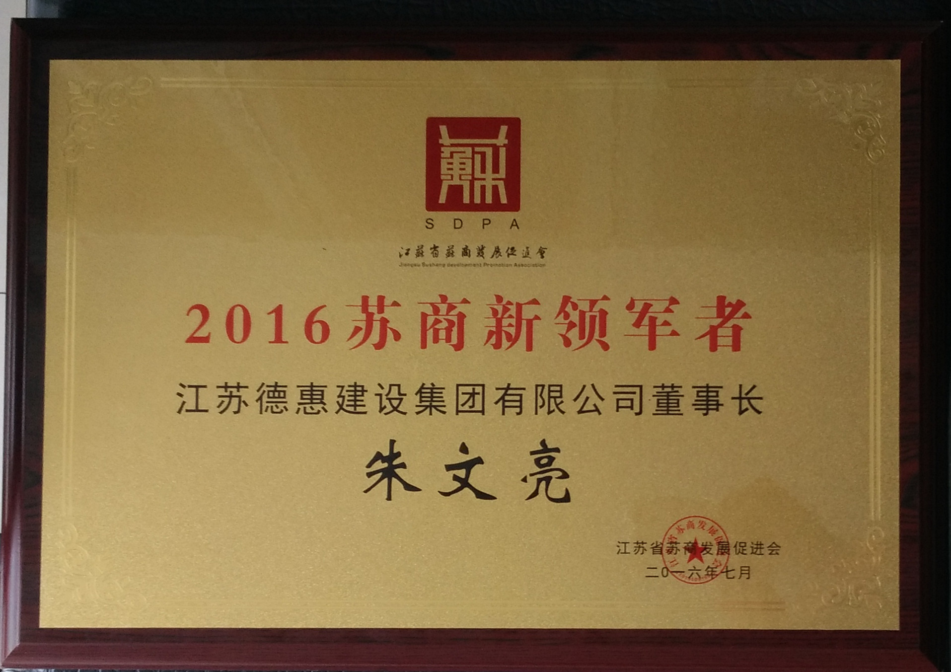 2016年7月9日,朱文亮董事长荣获“2016苏商新领军者”称号! |