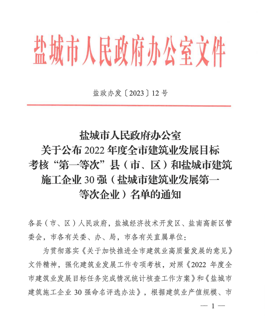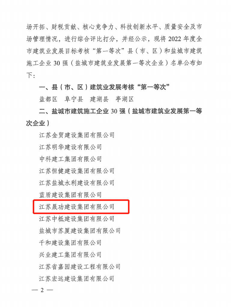 日前,盐城市人民政府办公室通报了《关于公布2022年度盐城市建筑业发展目标考核“第一等次”县(市、区)和盐城市建筑施工企业30强(盐城市建筑业发展第一等次企业)名单的通知》,晟功建设集团荣登盐城市建筑施工企业30强榜单,这也是集团连续四年蝉联盐城市建筑业发展第一等次荣誉称号。