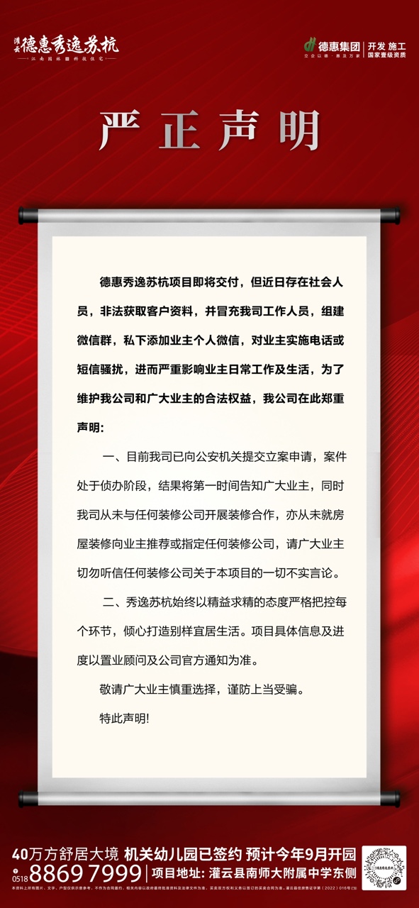 灌云德惠秀逸苏杭项目声明