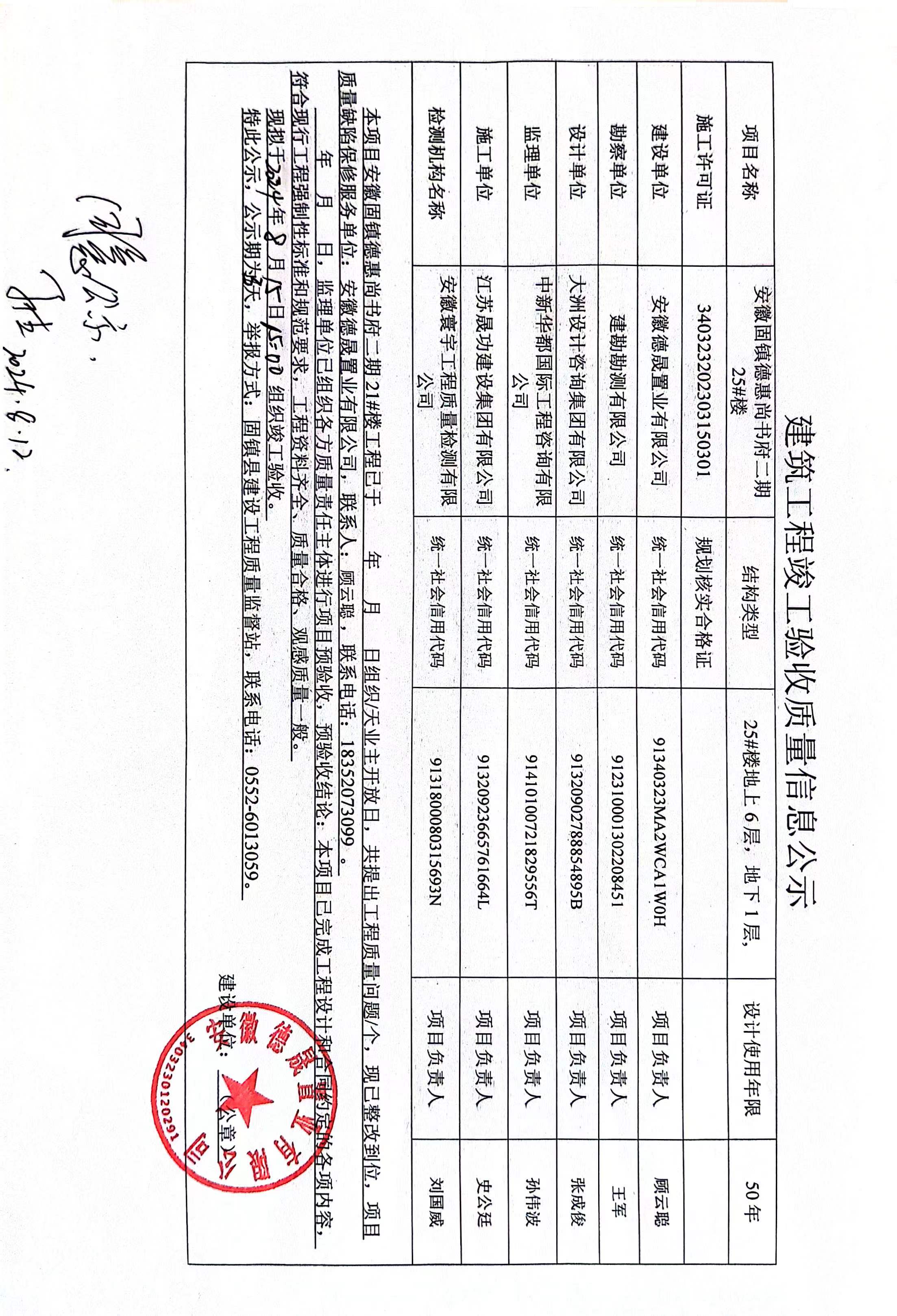 安徽固镇德惠尚书府二期25#楼建筑工程竣工验收质量信息公示