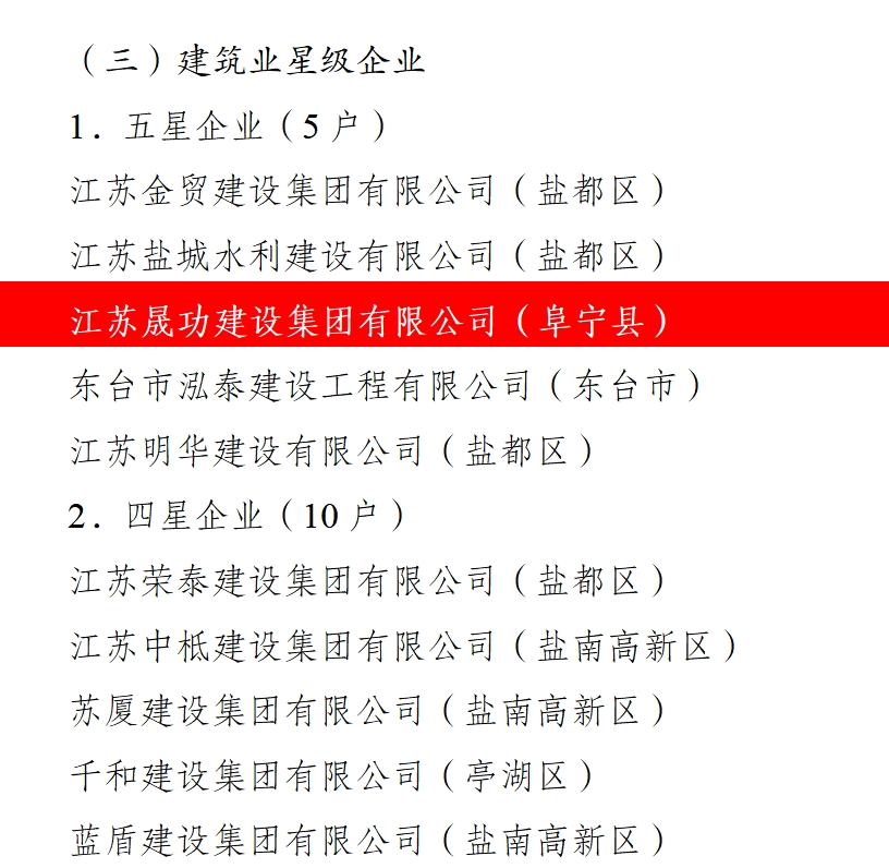 近日,中共盐城市委办公室公布了盐城市2024年度星级企业认定名单,江苏晟功建设集团有限公司获评江苏省盐城市“争星创优”建筑业五星企业认定;精品乱码一区二区三四区视频获评房地产“达星企业”认定。