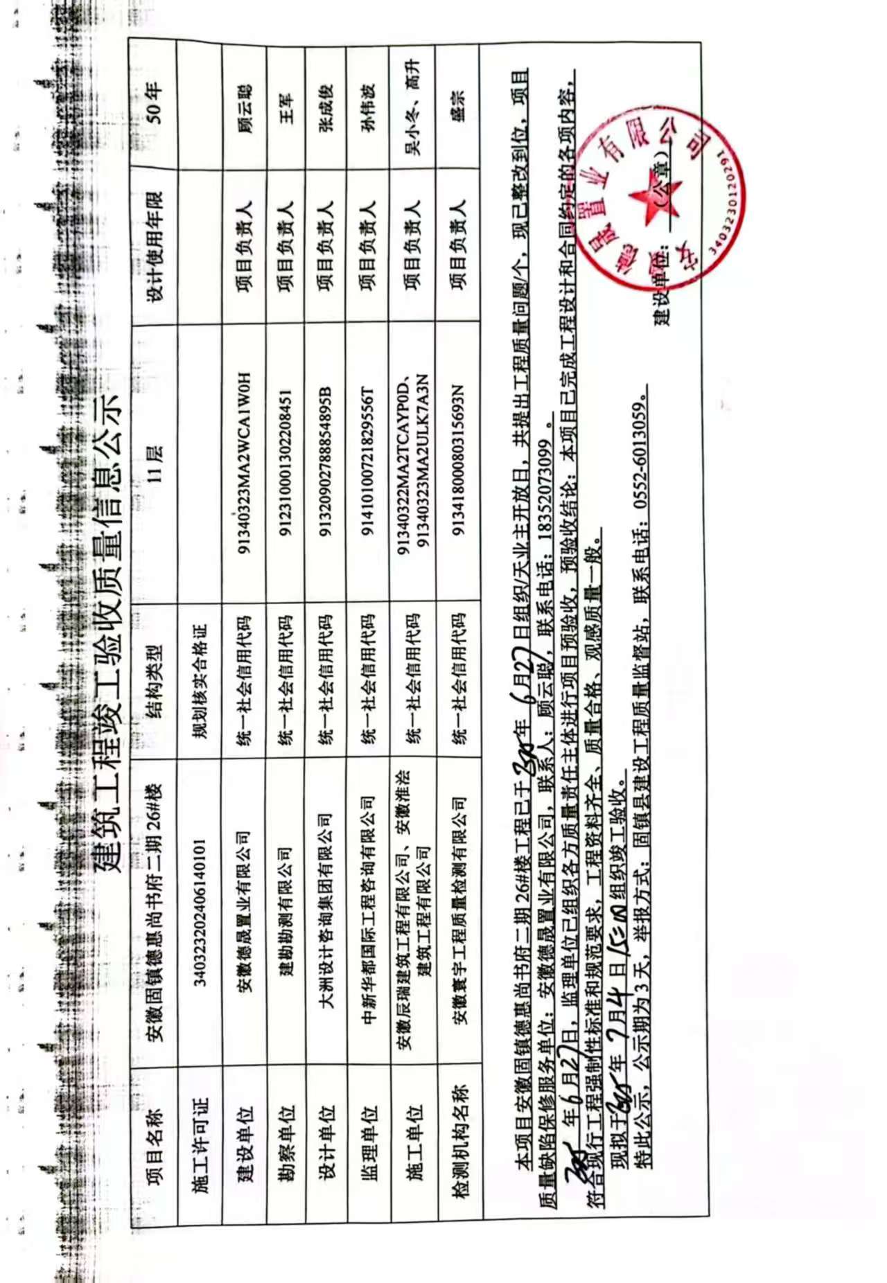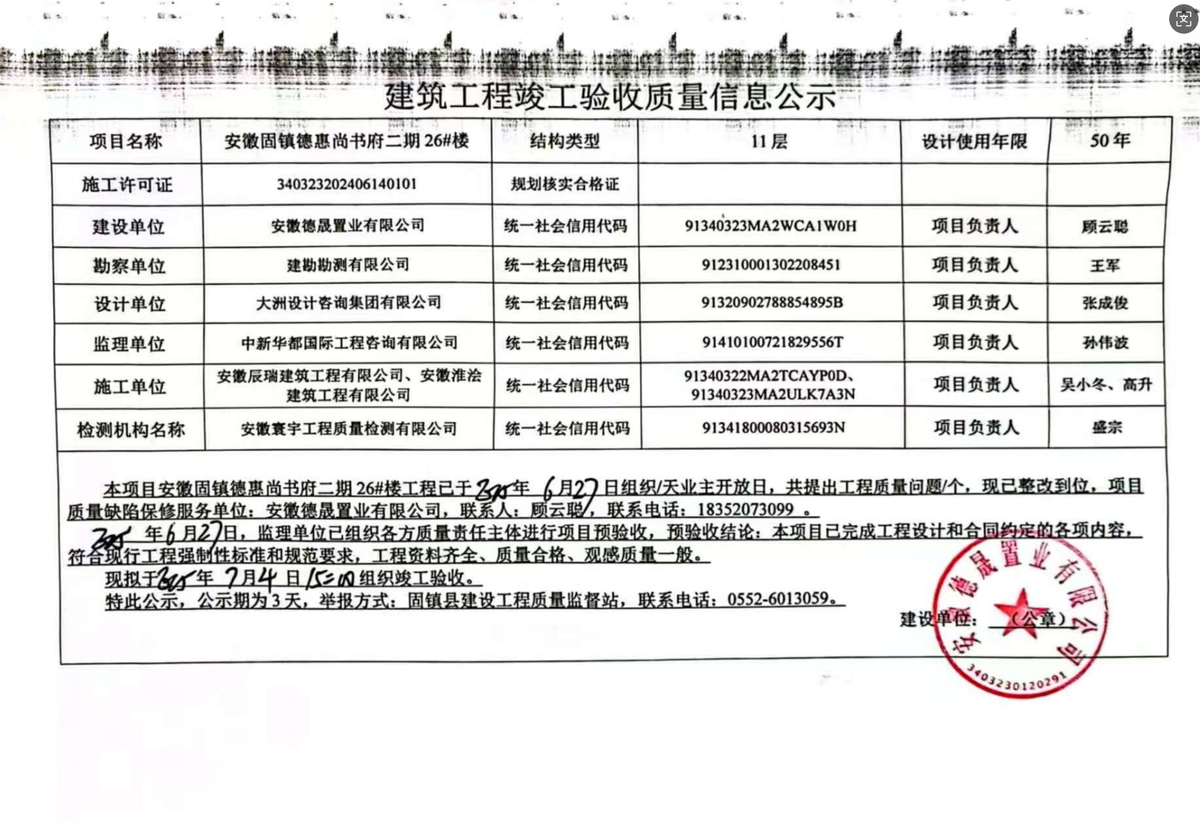 安徽固镇德惠尚书府二期26#楼建筑工程竣工验收质量信息公示